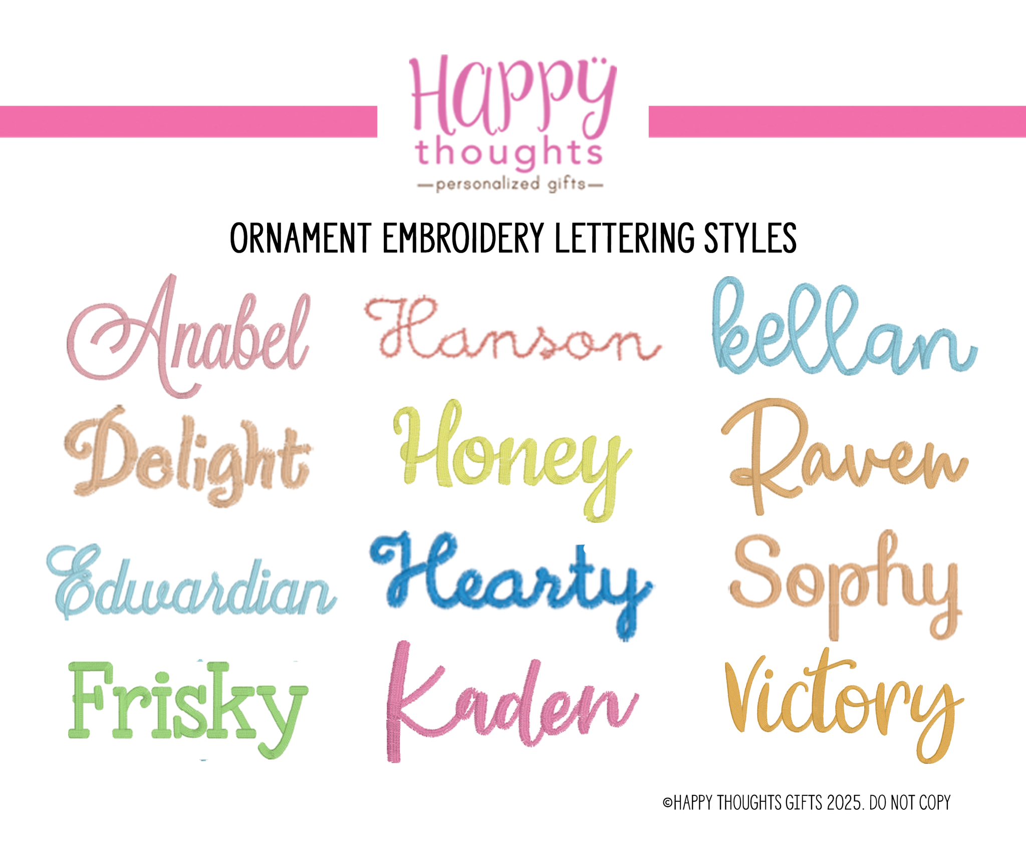 To order, select your design from the drop-down list and provide the personalization details in the box. Ornament will be personalized in the same colors and style as the samples shown. You may request a different lettering style for the name from the chart, if desired.