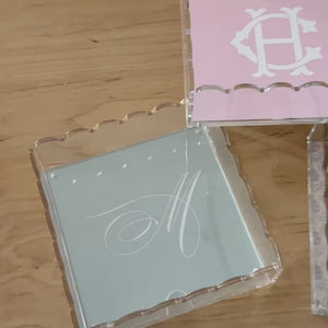 Meet the cutest way to stay organized. These scalloped acrylic catchall trays come with a personalized monogram insert that instantly brightens any desk, nightstand, or vanity. Perfect for keys, jewelry, paper clips, or just looking pretty.